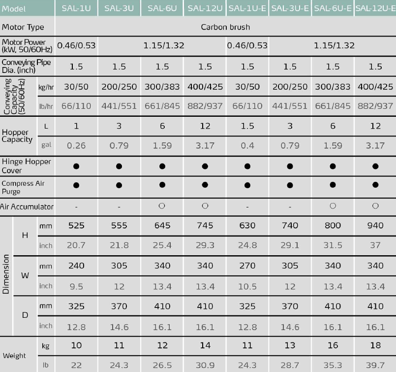 SAL-U series self-contained hopper loaders are Euro design with stainless steel hopper to avoid material contamination. In addition, it has an attractive appearance, a sound-proof motor cover to reduce noise level.
