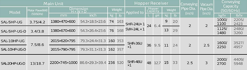 SAL-UG series separate-vacuum hopper loaders are based on the established design and now feature more attractive appearance, better performance, and improved ease of operation.